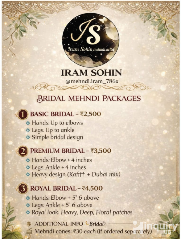 I am a skilled and passionate Mehndi Artist specializing in bridal, party, and traditional mehndi designs. With a creative eye for detail and years of experience, I create elegant, intricate, and long-lasting mehndi that enhances the beauty of every occasion.